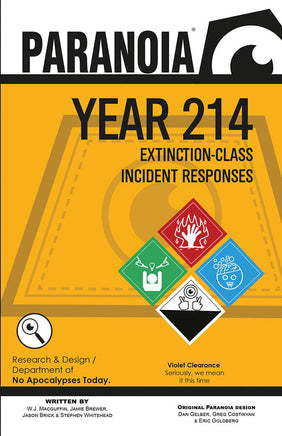 These are classified as extinction-class events because, to put it so a Troubleshooter can understand, they can literally destroy all of Alpha Complex, its citizens and maybe even Fried Computer! (Or to put it so an Infrared drone can understand, bad thing make stuff go bye bye.) At least so far, these events have been prevented thanks to the hard work and casual attitude towards casualties from service groups. This is the Extinction-class Incident Response Book. Inside, Paranoia GMs will find 15 different experiments that almost ended all that we know, love, hate, like, like-like and pretty much everything. These include: Ice-10 Water Product: Finally, water stops treasonously mutating into different forms and comes in an easy-to-store format. Just do not drink it. Seriously, don’t. Mobius Temporal Loop Recruiter: Are you close to missing that deadline? Recruit versions of you from other timelines as temps! What could possibly go wrong with that? Nutritive Anti-Malware Update 2.3m7: This helps lower-clearance citizens eat what they would normally never eat to reduce food waste. Too bad food is no longer a thing. Firekelp: Instead of mining for fissile materials to use in nuclear power plants, why not grow it? Because it tastes lousy, that’s why.