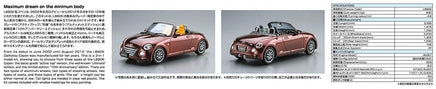 From its debut in June 2002 until August 2012, the L880K Daihatsu Copen was manufactured for ten years. This is a 3-in-1 model kit, allowing you to choose from three types of the L880K Copen: the basic grade "active top" version, the well-known "ultimate" edition, and the limited edition "10th Anniversary" edition. There are two types of aluminum wheels, two types of steering wheels, two types of seats, and three types of grills. The car’s height can be either normal or low. Tail lights are molded in clear red plastic. The kit comes included with window maskings for easy painting.
