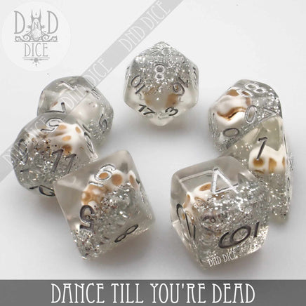 Note: This set has a skull in each shape but due to the random positioning of the skull, you may not be able to see the skull face in every die. Each die will be unique with regard to the skull and glitter positioning.