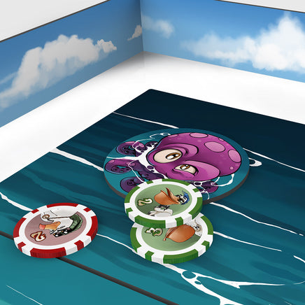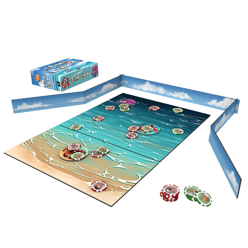 Fish N’Chips is a chip-throwing game, playable on a table, combining dexterity and tactics. In turn, each team throws chips of different values to score majorities on the different elements of the playmat.