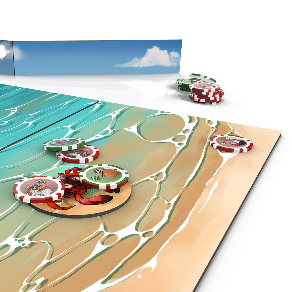 The playmat represents the beach, separated into three different zones. Three targets are placed on it representing the preys that birds covet! Each team has 12 chips of value 1 to 3, the birds of your gang! In turn, each team throws a chip of their choice, aiming at a target, an area of the beach or the opposing chips! Once all chips have been thrown, the sum of the values on each element is calculated, with a point awarded to the team with the highest total. The first team to win two rounds wins the game!