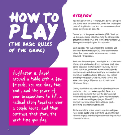 Slugblaster uses a stripped-down version of the Forged in the Dark engine, modified to power looking cool, doing tricks, circuit-bending gear, getting sponsorships, getting in trouble, hoverboarding away from monsters, and fast-paced laser-fantasy action in general.