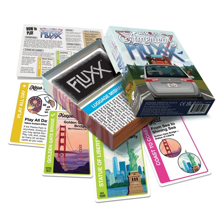 Road trip! The ever-changing card game is hitting the road and seeing the sites on a drive across the United States of America. From famous landmarks to national parks, it’s got everything from the Golden Gate Bridge to the Statue of Liberty, including the Grand Canyon, Hollywood, Cape Canaveral, Devil’s Tower, the monuments of DC, and, of course, Amusement Parks. Perfect for vacationers or armchair travelers, Across America Fluxx includes a few special twists, including the New Rule "Play All Day" and an Action called "Route 66." Who calls shotgun?