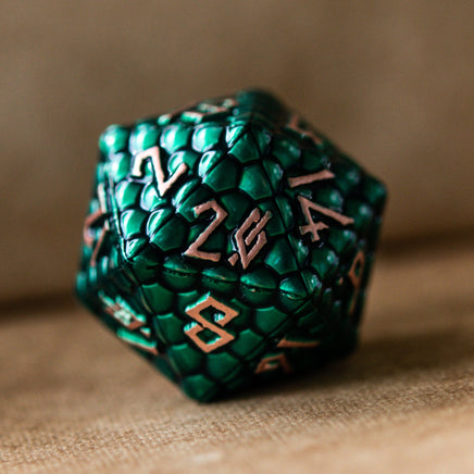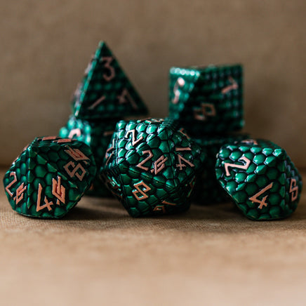 Our metal dice sets are all cast from zinc alloy metal to assure better balanced rolls. This set is perfect for any RPG and will be sure to impress at your upcoming session! Every set comes with its own metal dice tin or velvet dice bag.