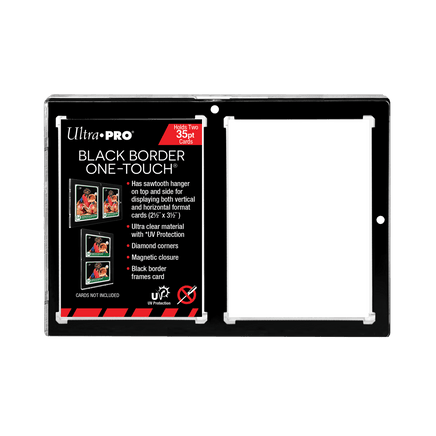 The 2-Card Black Border ONE-TOUCH display features a black border to perfectly frame your cards. Designed as the final destination for your collectible cards, our two-piece ONE-TOUCH holders are uniquely designed with slide-in hinge and magnetic closure so you'll never have to use a screwdriver again. The holder provides UV-resistant, no-PVC and acid free protection to ensure your valuable hit retains its condition while under display. Our ONE-TOUCH holders are ideal for presenting prized and super rare gaming cards as well. Has sawtooth hangers on the top and on the side of the display to allow displaying both vertical and horizontal format cards. This model can hold two standard cards (2-1/2" X 3-1/2") up to 35pt in thickness.