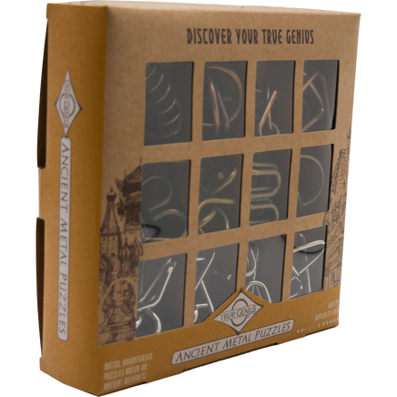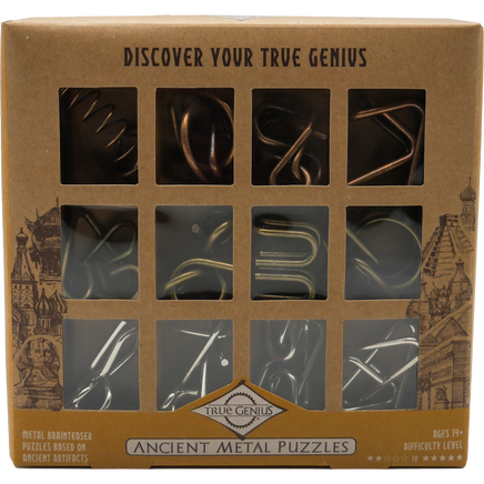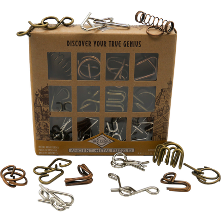 Travel through the Copper, Bronze, and Steel Ages with this set of 12 metal disentanglement puzzles that range from easy to difficult.