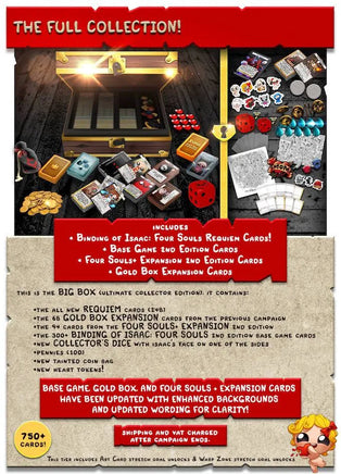 - 68 Kickstarter-Exclusive Four Souls Gold Box Expansion cards from the previous campaign,